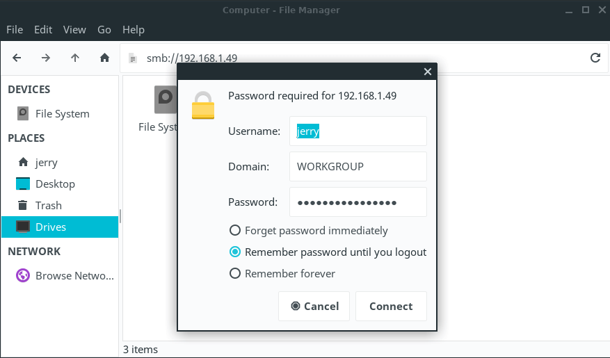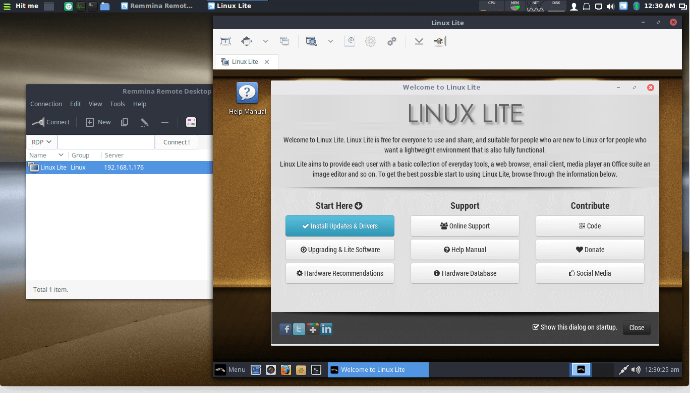 Double click on the machine name. A username and password dialogue box will pop up, enter in the user and password we created in the Create Linux Lite Shares tutorial above.