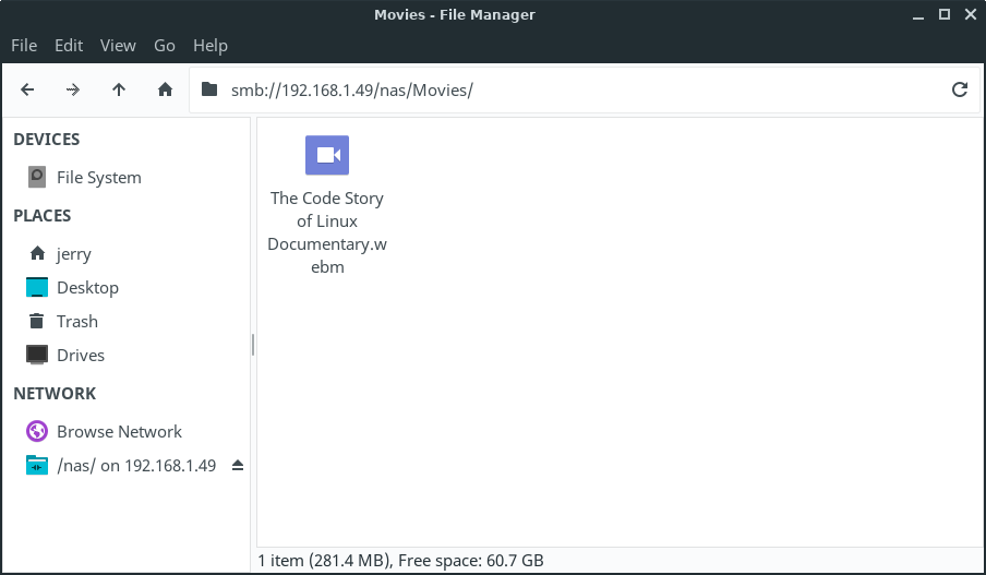 Lets look inside the Movies folder for this device, as you can see I have a movie file in there called The Code Story of Linux Documentary.webm