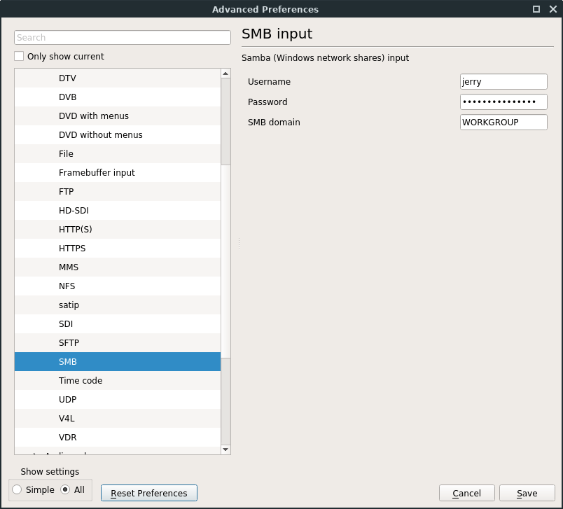In the window that pops up, in the bottom left click on All. Then on the left, expand Input / Codecs, Access modules, SMB. Then put in your NAS's username, password and finally the SMB domain (Workgroup). Click on Save to finish and close VLC.
