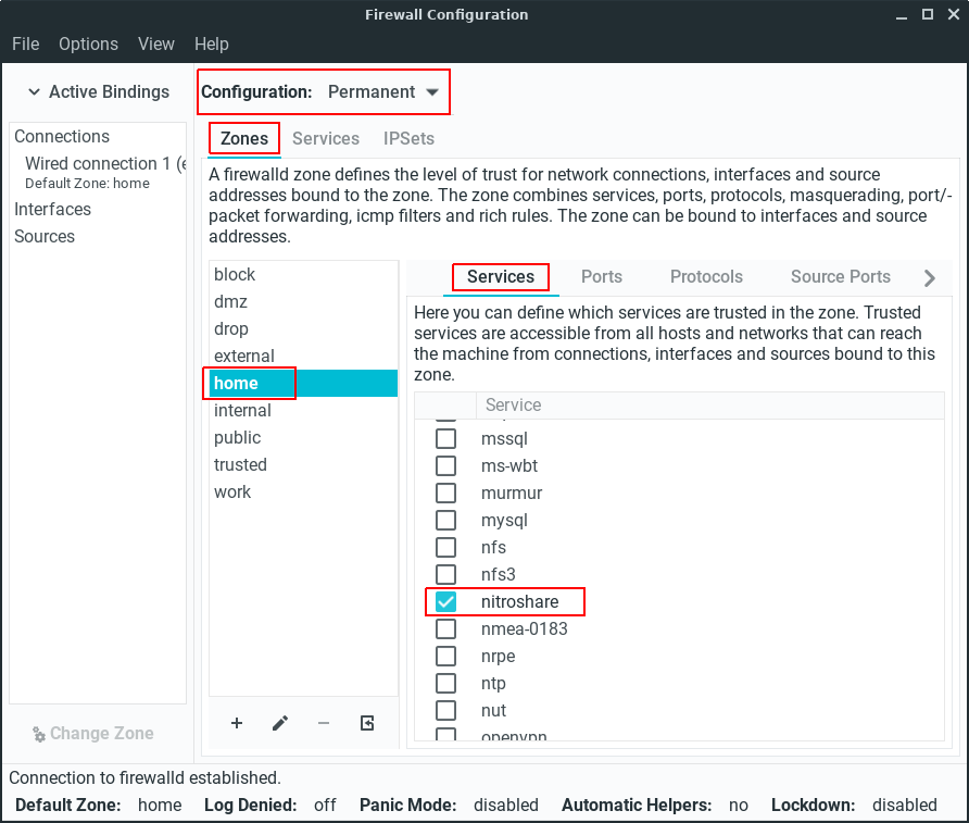 In Linux Lite, the Firewall (disabled by default) has been preconfigured to allow NitroShare traffic. Make sure your Firewall has been set to home before beginning this tutorial if you are going to use a Firewall. See here for more information on this. If you're running Linux Lite make sure you place a tick in nitroshare as shown below. In the Firewall, click on Configuration - Permanent, place a tick in nitroshare as shown below, then click on Options, Reload Firewalld.