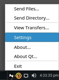 Go to Menu, Internet, NitroShare. Click on the Close button that pops up one time only, and then right click on the NitroShare tray icon and choose Settings.