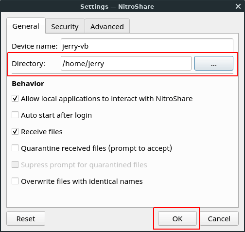 Choose the directory where you want to receive files to. Leave the other settings, unless you want to change them. Click OK when done.