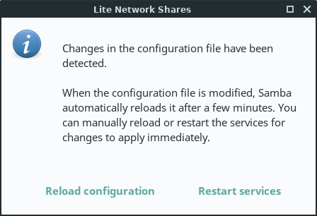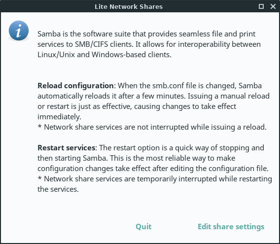 A Network Share is a computer resource made available from one computer to others on a computer network such as files, folders and printers to mention the most common. These resources can be remotely accessed from another computer, typically via a local area network or intranet, transparently as if it were a resource in the local machine. Linux Lite includes the Lite Network Shares application to help in configuring your shares for access from other computers in your network; e.g.: a Windows machine. In Linux, the suite that provides seamless file and print services interoperability for Windows, Linux and Unix is known as Samba.