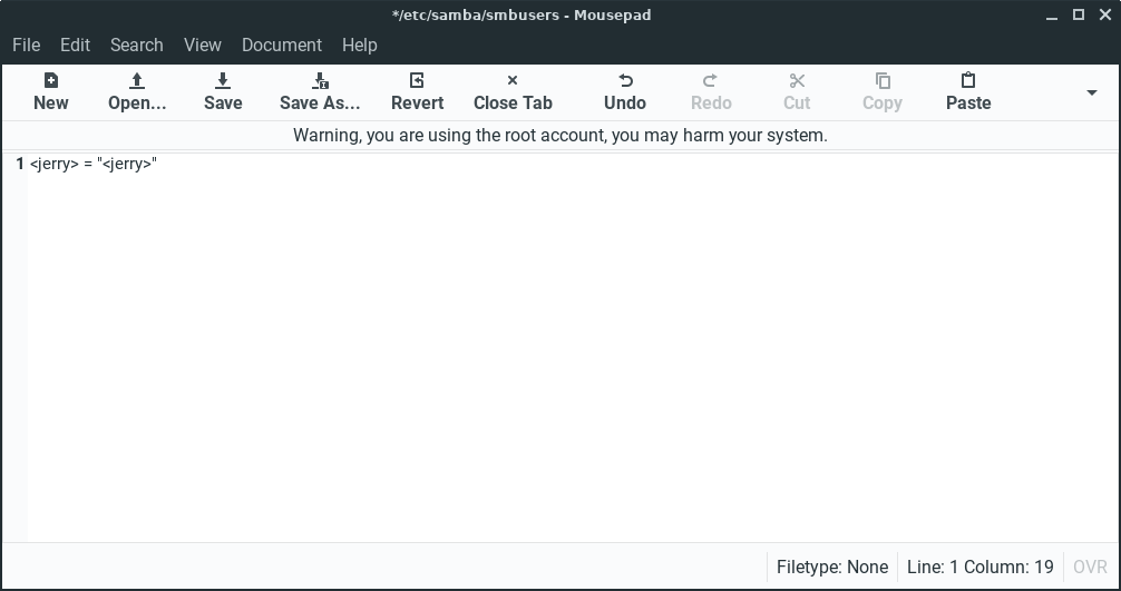 The file will open in the Text Editor. The smbusers file will contain a username map list (one per line) of your Linux Lite and SMB accounts. We will replace the default linux = "linux" in that file with our Linux Lite username in each of the brackets: