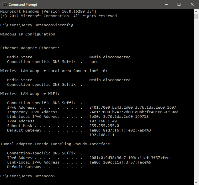 Usually the results at the top has your ip address listed. In the above example, the IPv4 Address is: 192.168.1.49 Make a note of this ip address.