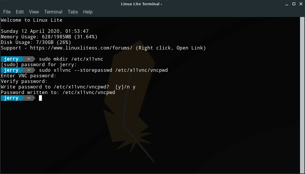 Now we'll create an encrypted password file and save it in /etc/x11vnc/. You will be prompted to type and verify the password:
