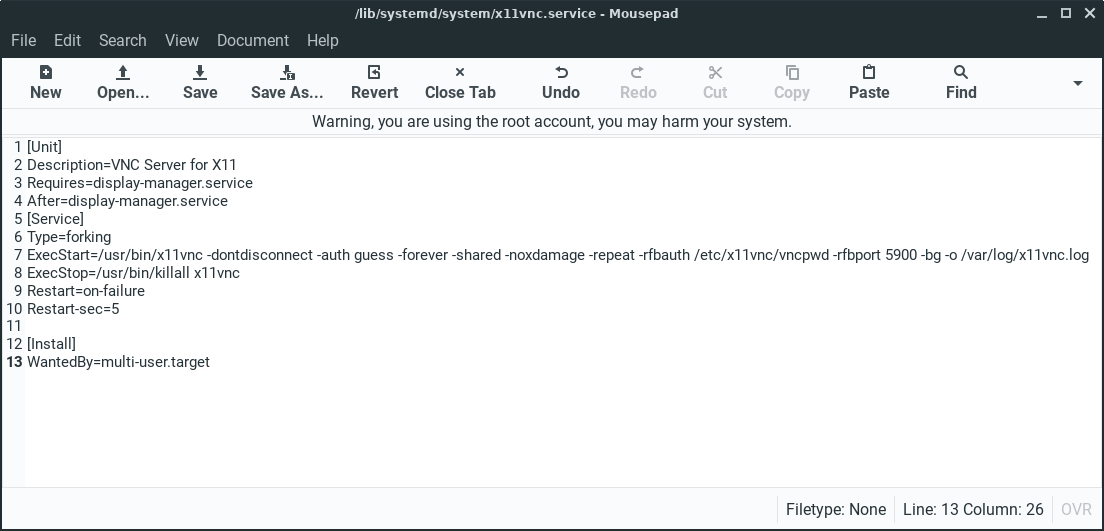 Save changes and close leafpad. Then copy /lib/systemd/system/x11vnc.service to /etc/systemd/system/