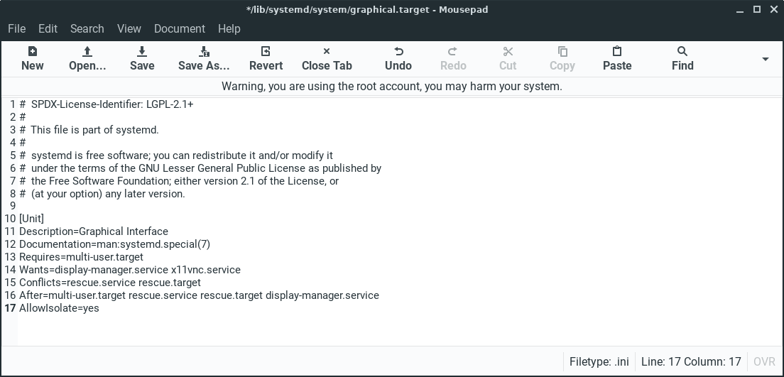 pkexec mousepad /lib/systemd/system/graphical.target
