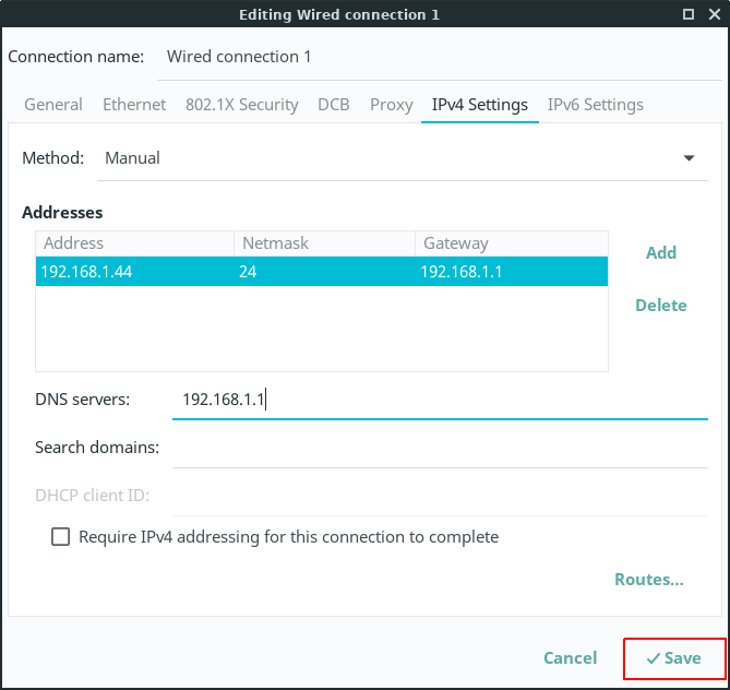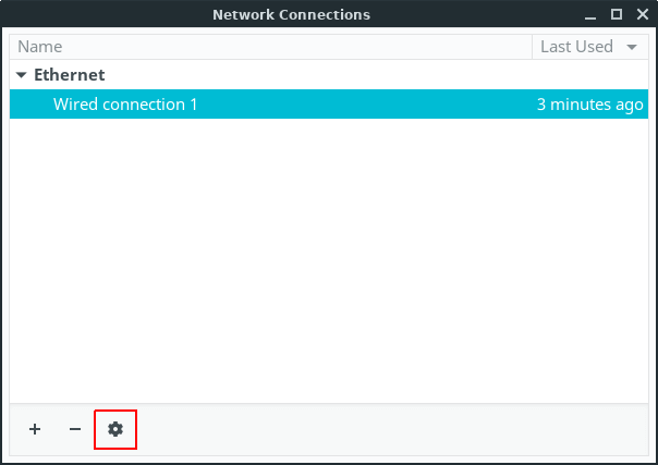 Highlight the Wired connection entry, and click on the Edit (cog) button.