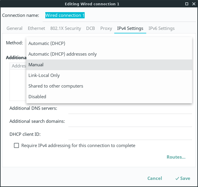Click on the IPv4 or IPv6 tab (consult your ISP on which one to use, IPv4 is the default) and select Manual.