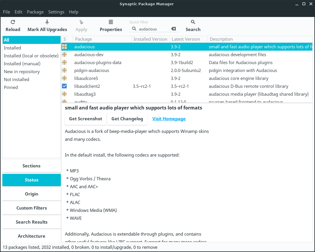 What you will see when installing from Menu, System, Package Manager (Synaptic Package Manager).