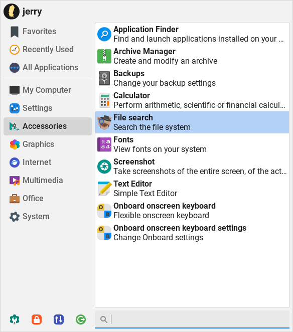 File search is an easy to use GUI file search utility found under Menu, Accessories, File search.