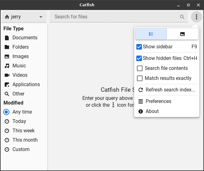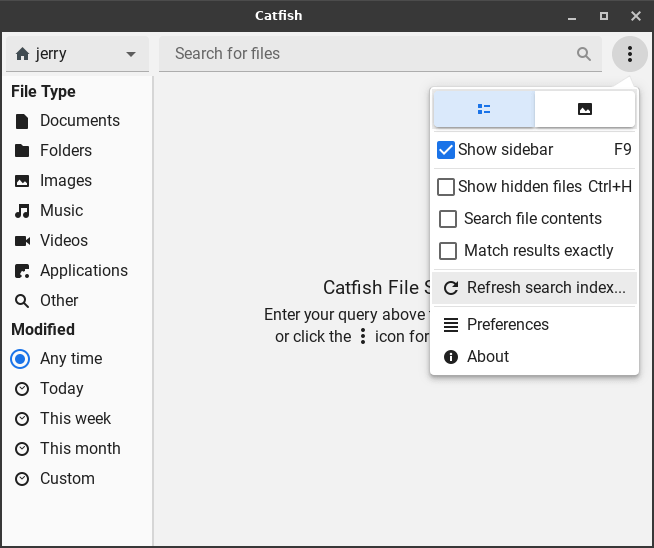 Upon opening File search, you will see this file search window: Click the gear icon in upper-right corner and choose Refresh search index.