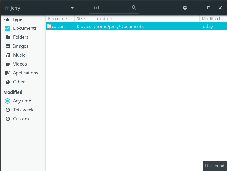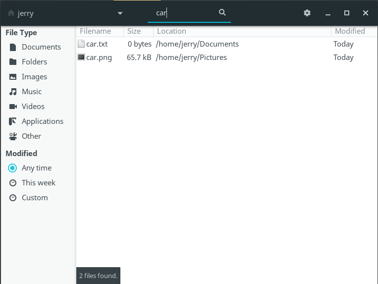 The example below shows a search in my Home folder for any file with car in the file name.