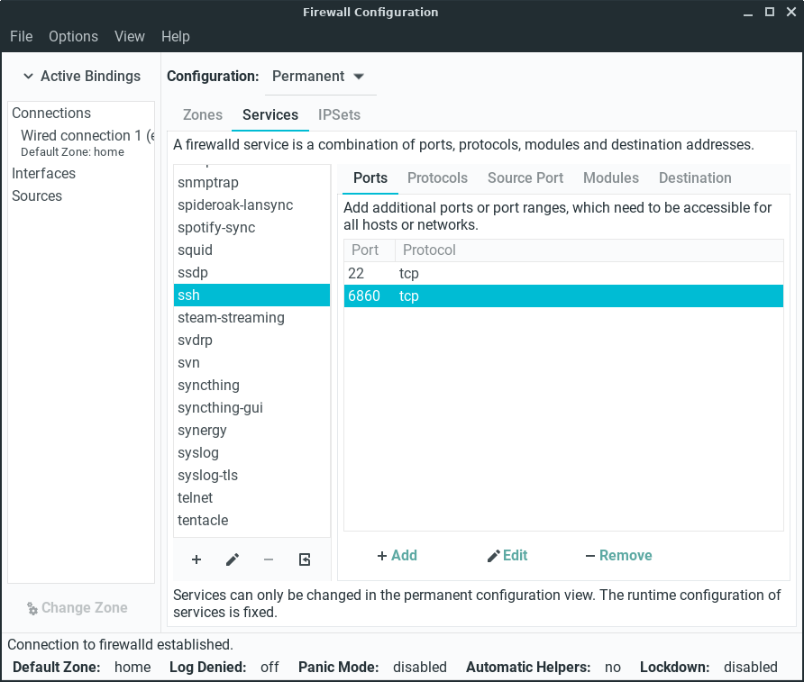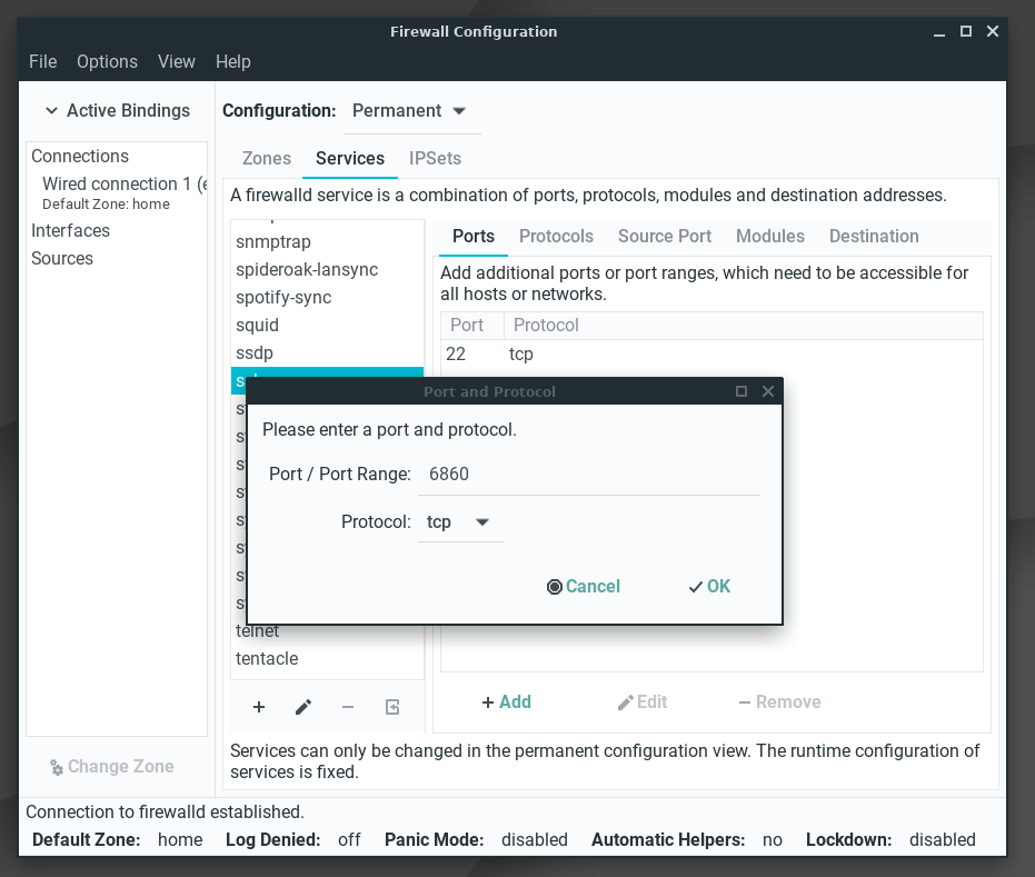 Port 6860 has now been added. The server admin should now remove port 22 by selecting it and clicking on the -Remove button. Click on Options, Reload Firewalld to activate our new firewall rule, enter your password if prompted.