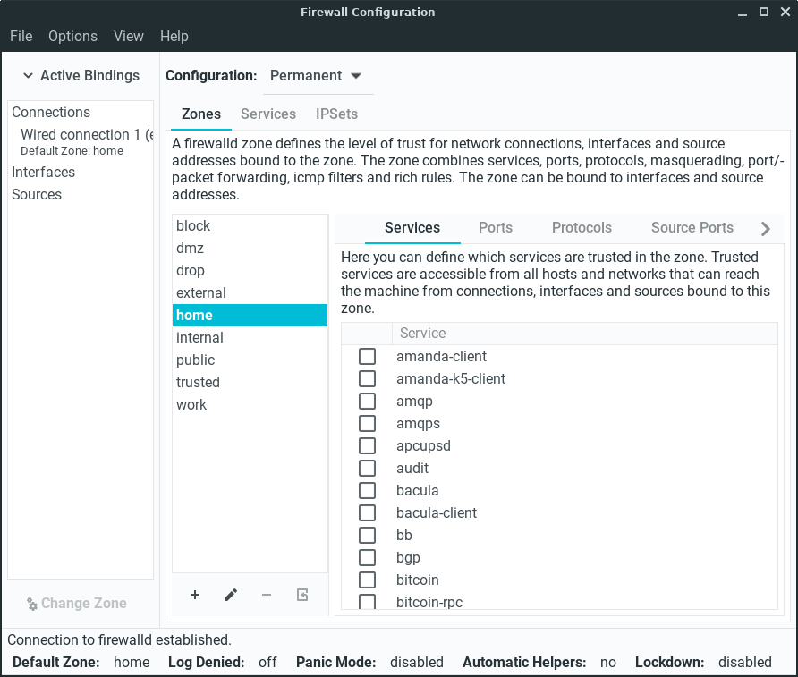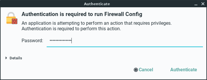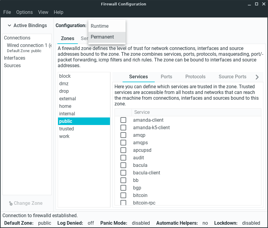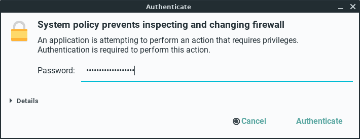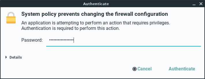 Click on Options, Reload Firewalld to activate our new firewall rule, enter your password if prompted.