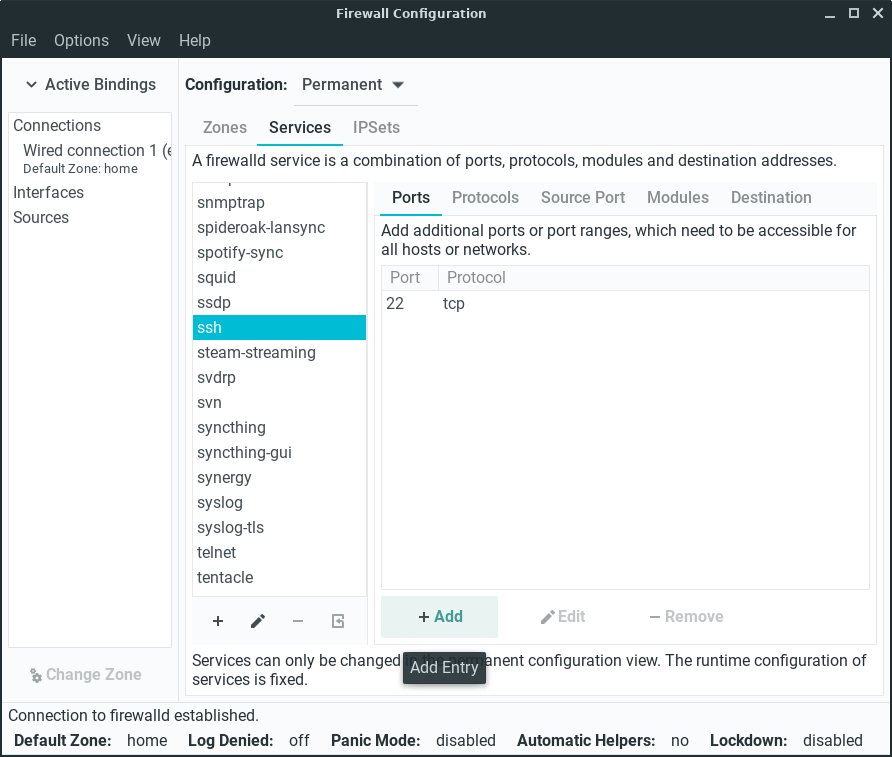 Click on the Services tab and select ssh from the left pane. Then click on +Add at the bottom.