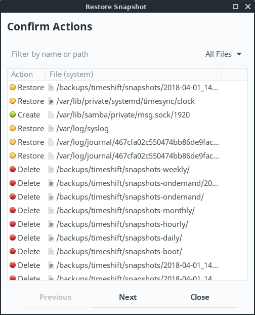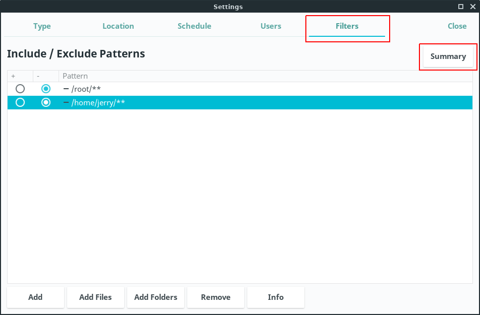 You can also specify Filters to include or exclude files or directories from the snapshots. Timeshift is designed to protect system files and settings. User data such as documents, pictures and music are excluded by default. This prevents you from overwriting your documents when you restore a snapshot or using all of your storage to backup media (pictures, music, and video) files. We recommend you use the Backups application in the Accessories menu for your home folder backups, and use Timeshift for system backups, the choice is yours.