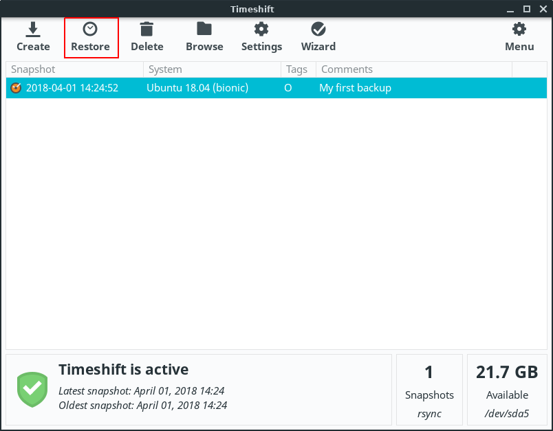 Restoring a Backup is as simple as selecting the snapshot you wish to restore and clicking on the Restore button.