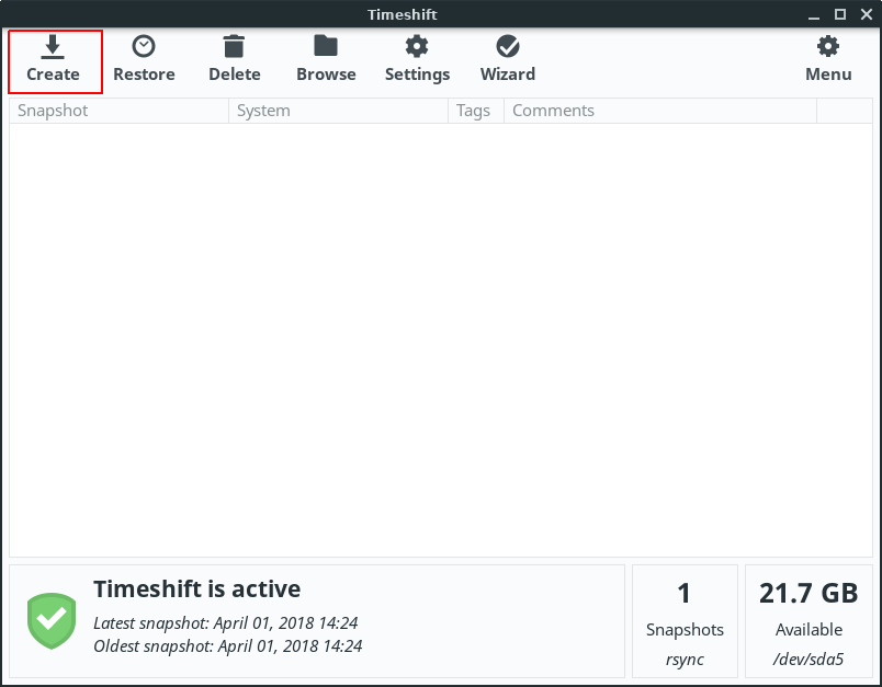 Creating a snapshot is simple. Just click on the Create button and your first snapshot will be created. Depending on what should be included or excluded from the snapshots, it will take several minutes for the process to complete.