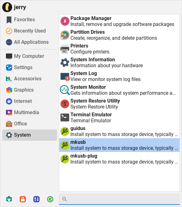 Launch mkusb, Menu, System, mkusb.