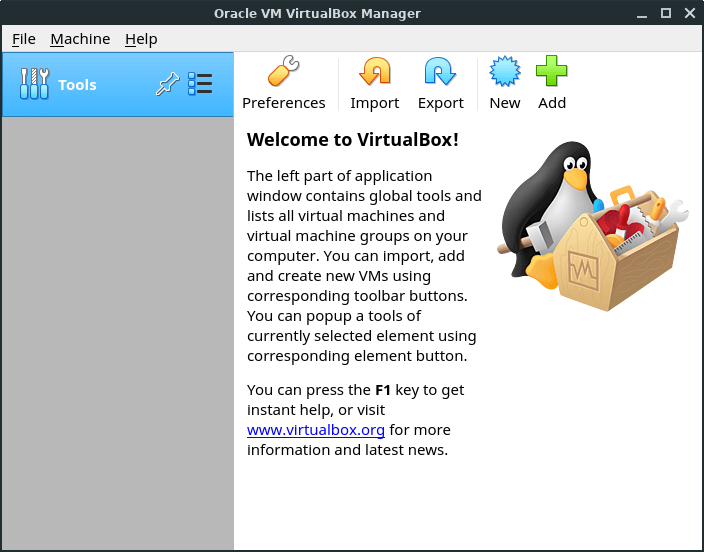 VirtualBox does not come pre-configured to use USB sticks. You need to download an extra package for that from their website. Go ahead and start VirtualBox, then follow the steps below to install what you need for USB support.