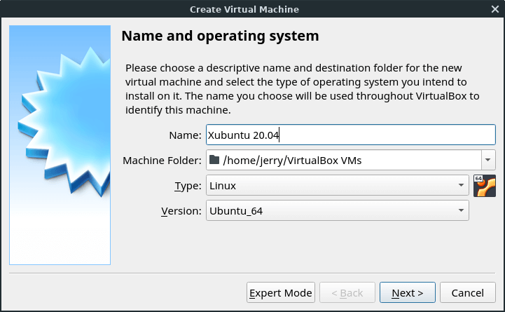 In this example, we will make a new machine for another Ubuntu-based distro called Xubuntu 20.04 and we are using its 64-bit version. There is no listing for Xubuntu, so we'll just choose Ubuntu_64 because that is what it is based on. (If you made a virtual machine [VM] with Linux Lite installed, you would also choose Ubuntu for the same reason.) Click Next to continue.