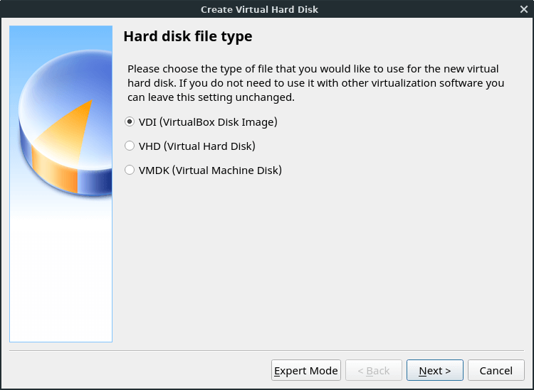 We'll choose VDI (VirtualBox Disk Image) from the Hard disk file type screen.
