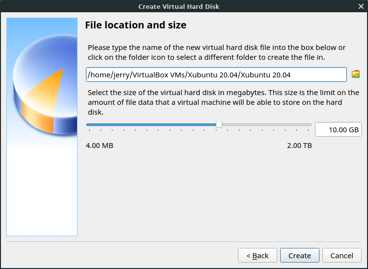 On the next screen we make the virtual drive 10GB. (VirtualBox will dedicate space from your hard drive for the virtual drive - so be sure you have enough room on your HDD to accommodate creating the virtual drive.)