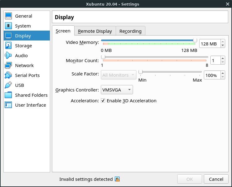 You can adjust a few settings for the VM either before or after installing the OS. We'll do it before installation. Highlight the VM and click Settings. Then, click Display along the left side and adjust the amount of video memory you want the VM to have. (Default is 16MB, we'll give it 128MB in this example.) Also, click to Enable either 3-D or 2-D Acceleration. (If one gives you an "invalid settings" message, unclick it and choose the other.)