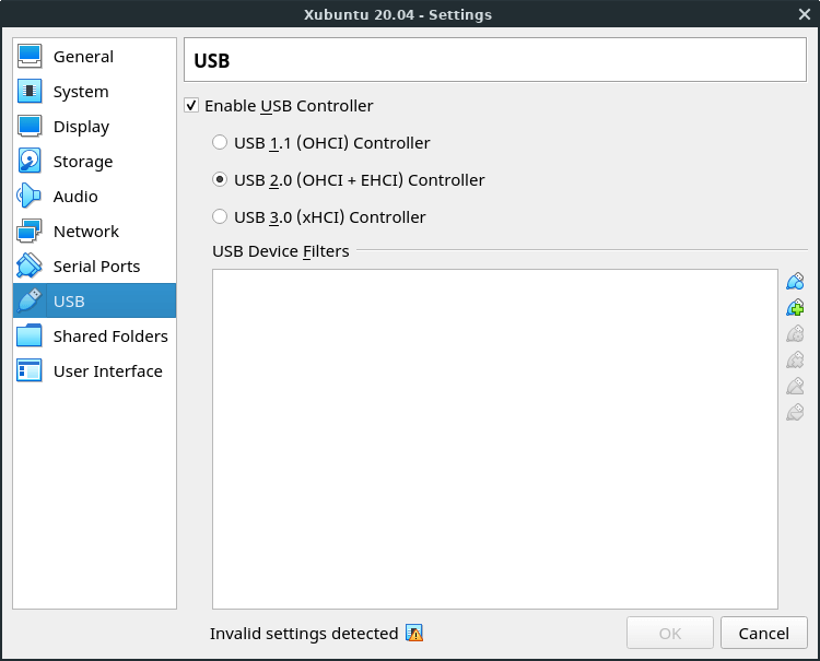 Now, click USB on the left side and make sure that the USB controllers are enabled. This will allow you to copy to/from USB sticks in the VM.