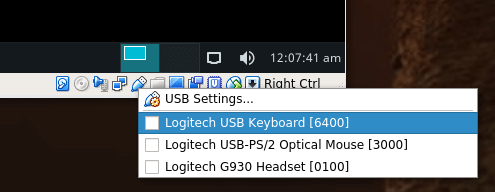 Once up and running you will see a little USB icon along bottom right edge of the VirtualBox window. Right-click on it to choose the USB you want to use.